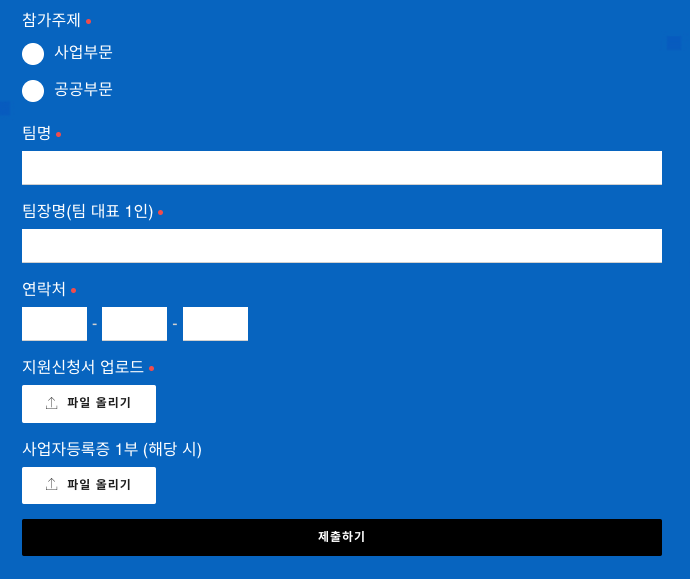 - 제출 서류 : 지원신청서, 개인정보 수집 이용 및 제3자 제공 동의서, 아이디어 기획서, 사업자등록증(해당 시)